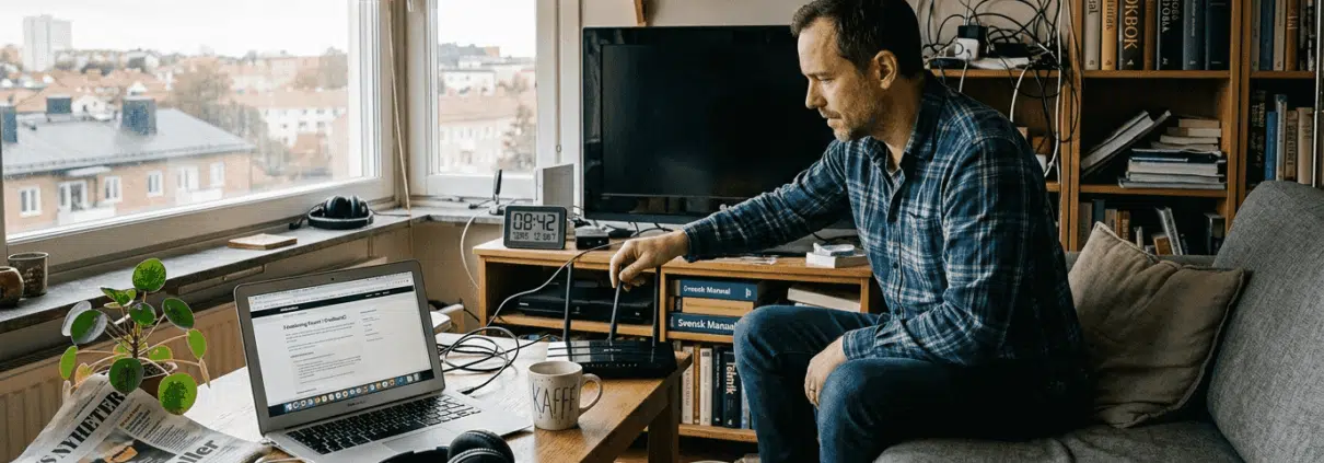 Många wifi-problem beror på enkla misstag som är lätta att åtgärda. Dålig placering kan minska signalstyrkan upp till 70%, så dubbelkolla att routern inte står bakom mikrovågsugn, TV eller i ett stängt skåp. Flytta den till en öppen, central plats.