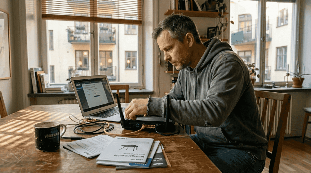 Installerar och ställer in routern hemma i lägenheten på Södermalm